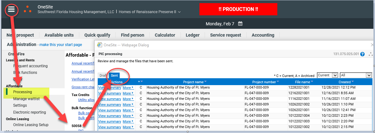 You can also see files that had been sent previously. When you are on PIC processing, there is a sent tab. This will show all files that have been created.