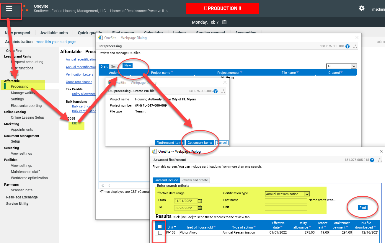 Go to the navication menu: Select Affordable > Processing > 50058 > PIC. Select the New button > get unsent (you can also find sent files and resend if needed). Fill in the criteria to find the files you want to send. Find. Select files you want to send. At the bottom there will be an include button. The files will be added to the review and create tab. Go to that tab and create the file. There will no be a file in draft. You can select it and download to your computer. You will be able to upload to PIC.